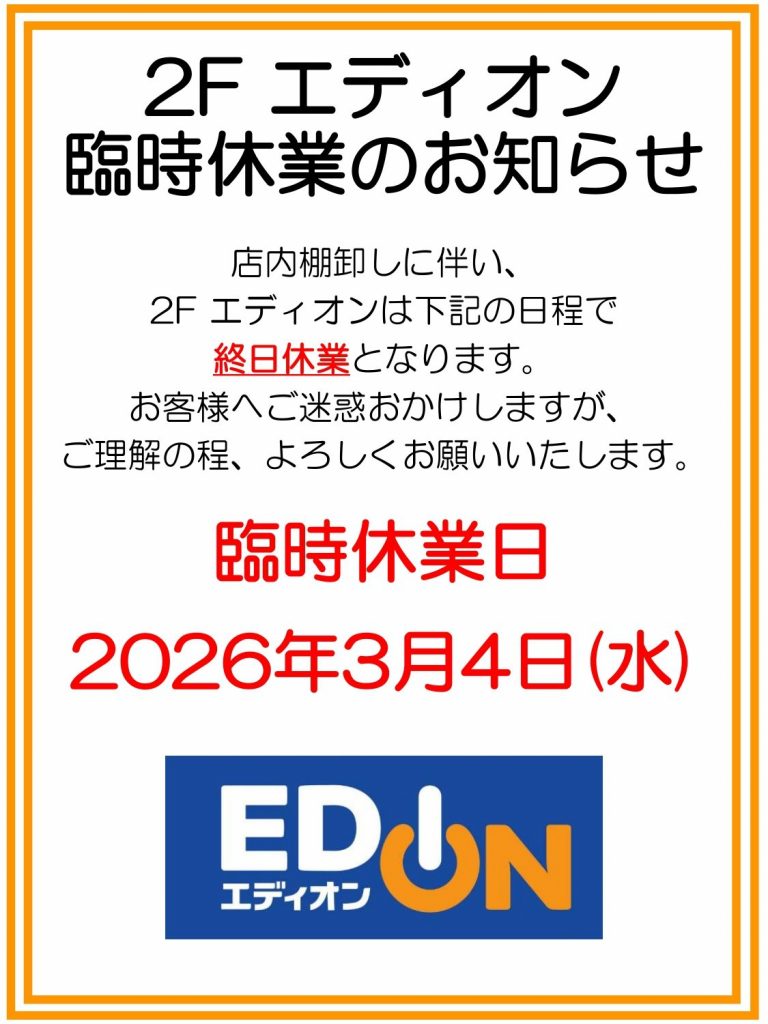 <3/4(水)>エディオン臨時休業のご案内 <3/4(水)>エディオン臨時休業のご案内 2026年3月4日(水)に棚卸の為、臨時休業致します。 ※店内にお入り頂く事ができません。 ご不便お掛け致しまして、誠に申し訳ございませんが、 ご理解の程、宜しくお願い申し上げます。