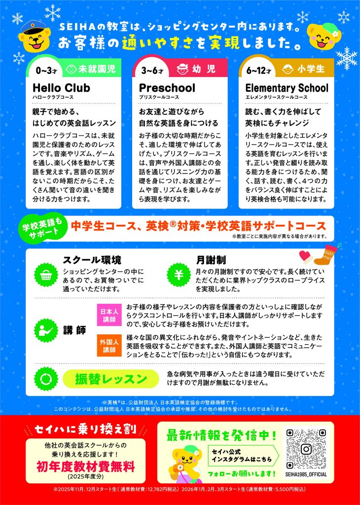 0歳からのこども英会話教室セイハ英語学院です。