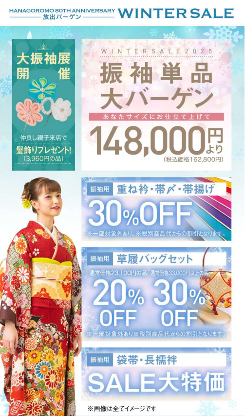 1階HANAGOROMOにて、12/15(月)まで、大振袖展を開催いたしております。